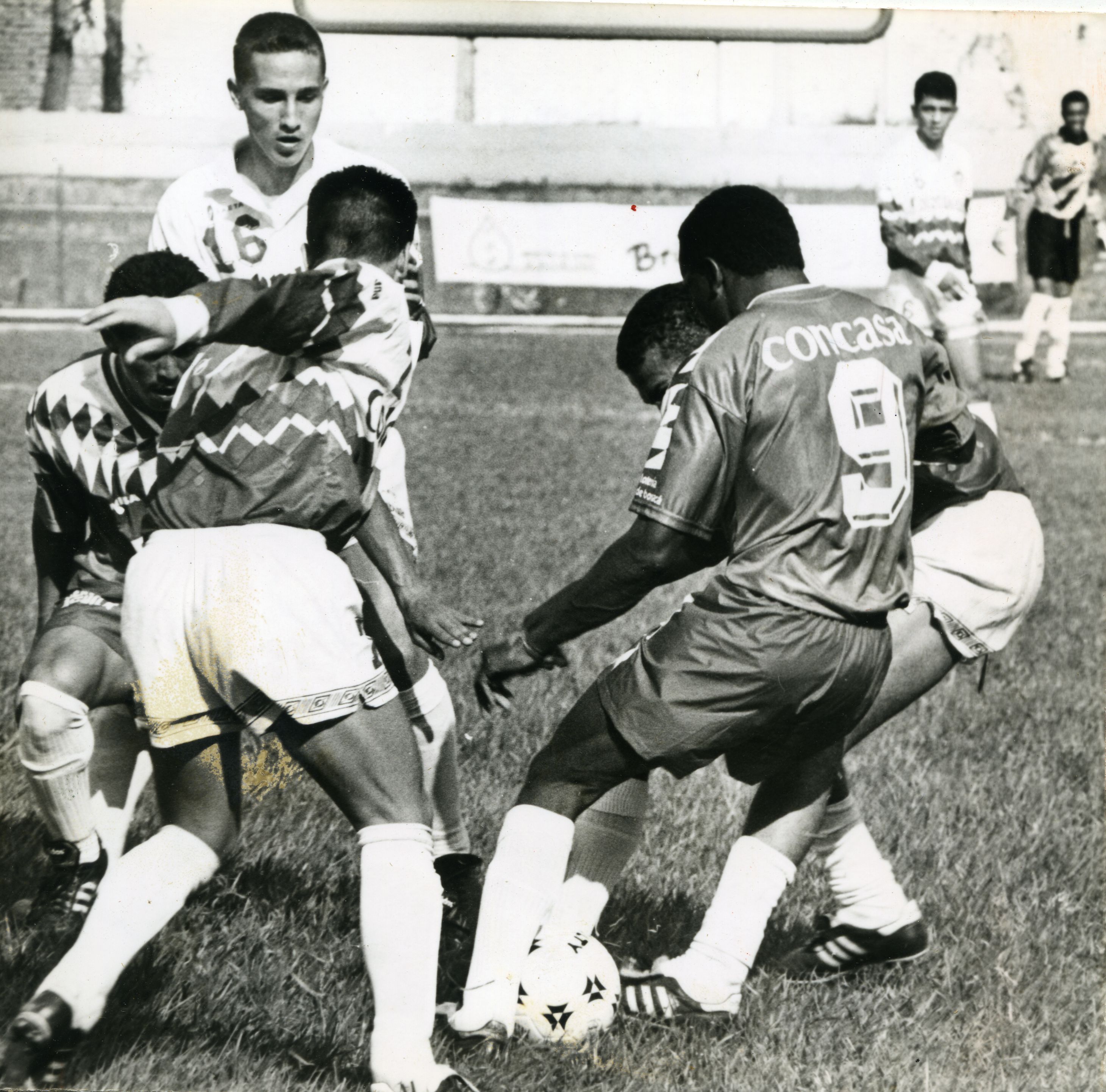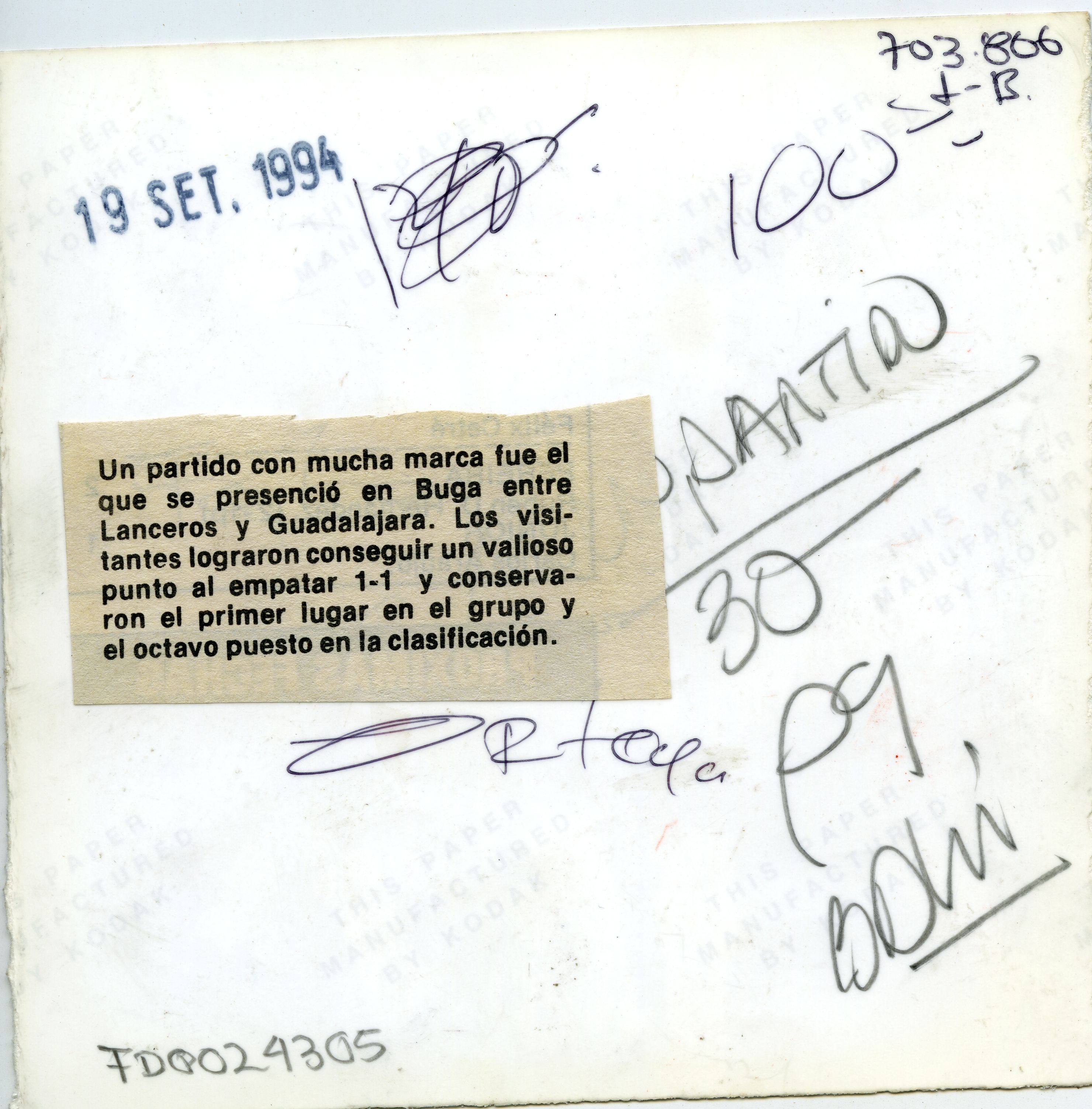 Al reverso de la fotografía se anexa recorte: un partido con mucha marca fue el que se presenció en Buga entre Lanceros y Guadalajara. Los visitantes lograron conseguir un valioso punto al empatar 1-1 y conservar el primer lugar en el grupo y el octavo puesto en la clasificación