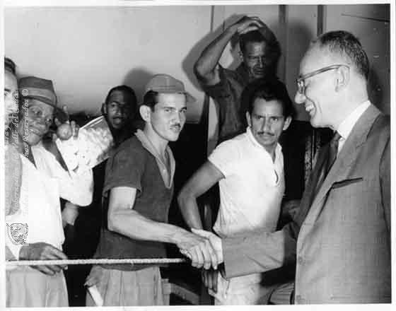 El presidente Alberto LLeras Camargo durante la visita que realizó a la fábrica Propal, saluda a los trabajadores