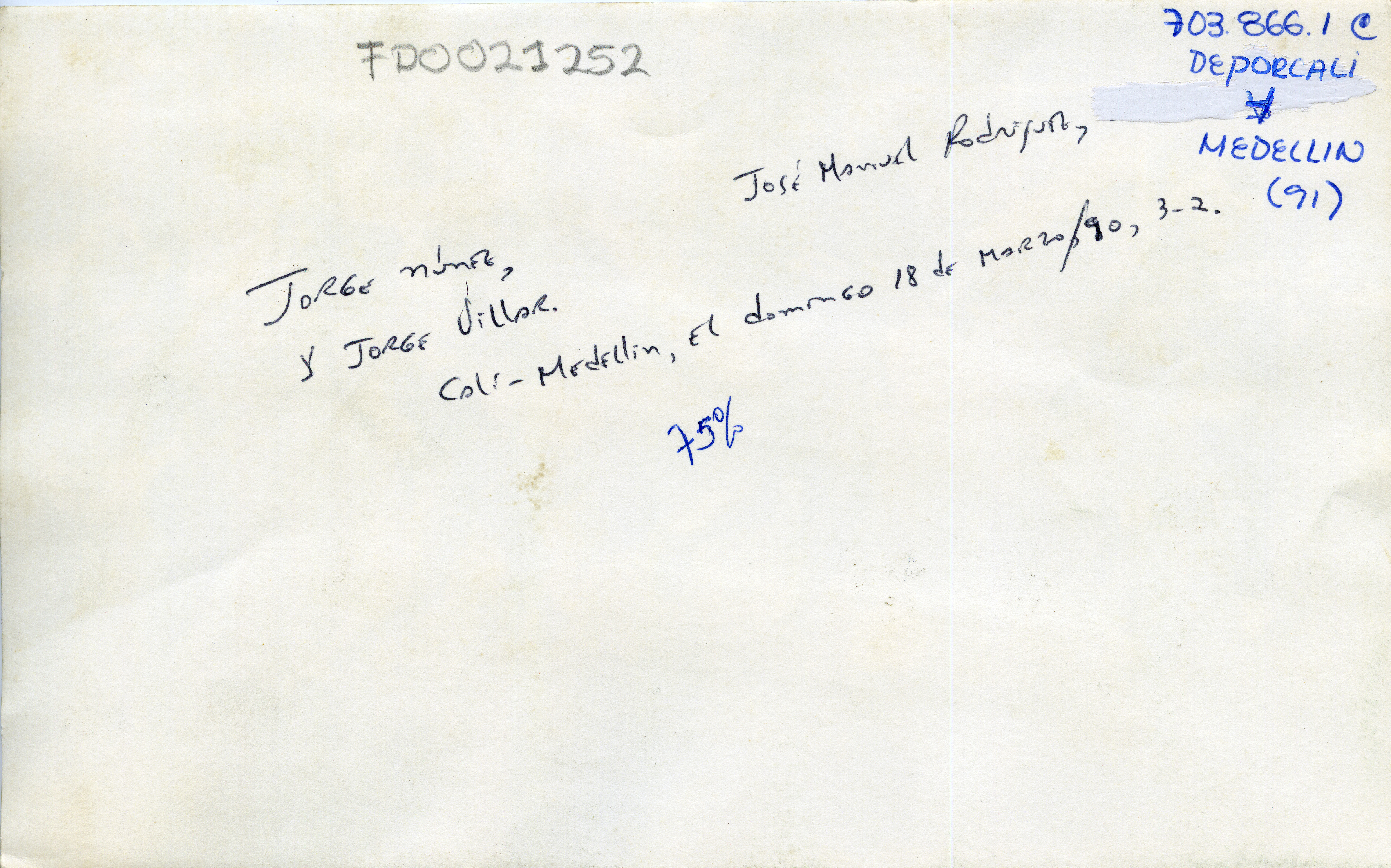 Partido de fútbol en el estadio Pascual Guerero entre Deportivo Cali vs Medellín. Se aprecia en la gráfica a Jorge Amado Nunez, José Manuel Rodríguez y Jorge Villar