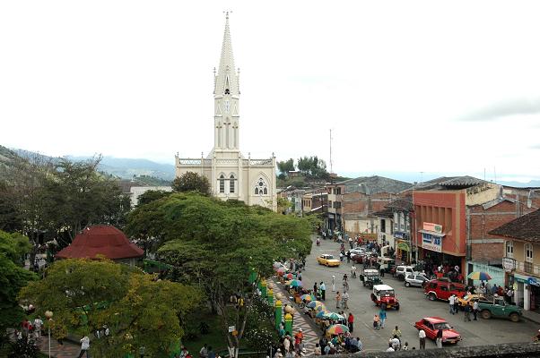 Sevilla, Valle del Cauca. Fundado en 1903, por Eraclio Uribe y Colonos antioqueños y caldenses. Nombres: San Luis. Municipio desde 1914. Economía importante en agricultura, caficultura, ganadería, comercio, minería, entre otros. Atractivo turístico: Basílica San Luis Gonzaga, Café Casablanca, fincas cafeteras. Observamos en la imagen, toma del parque de la Concordia y al fondo la iglesia gótica de Sevilla