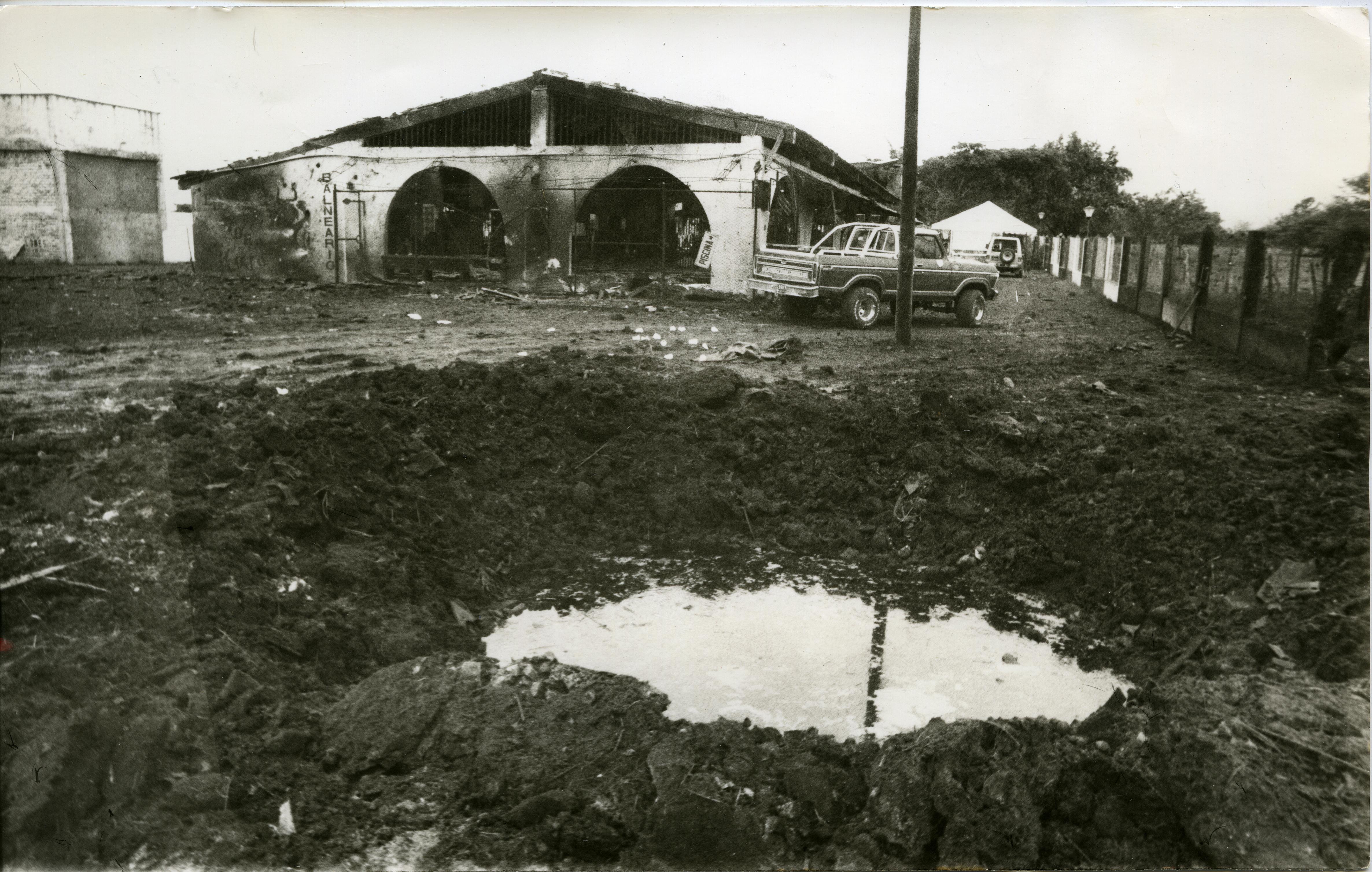 En la gráfica se observa la estructura en la que funcionada el balneario "Toro Rojo" luego de sufir la explosión de un carro bomba. Se observan también dos autos y, en primer plano, un hueco en el suelo lleno de agua.
