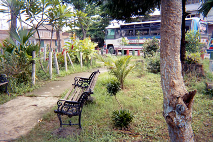 Primer plano de parque. Realce de tronco en costado derecho, en contrapunto a silla. Autobus en tercer plano. Unidad cromática.