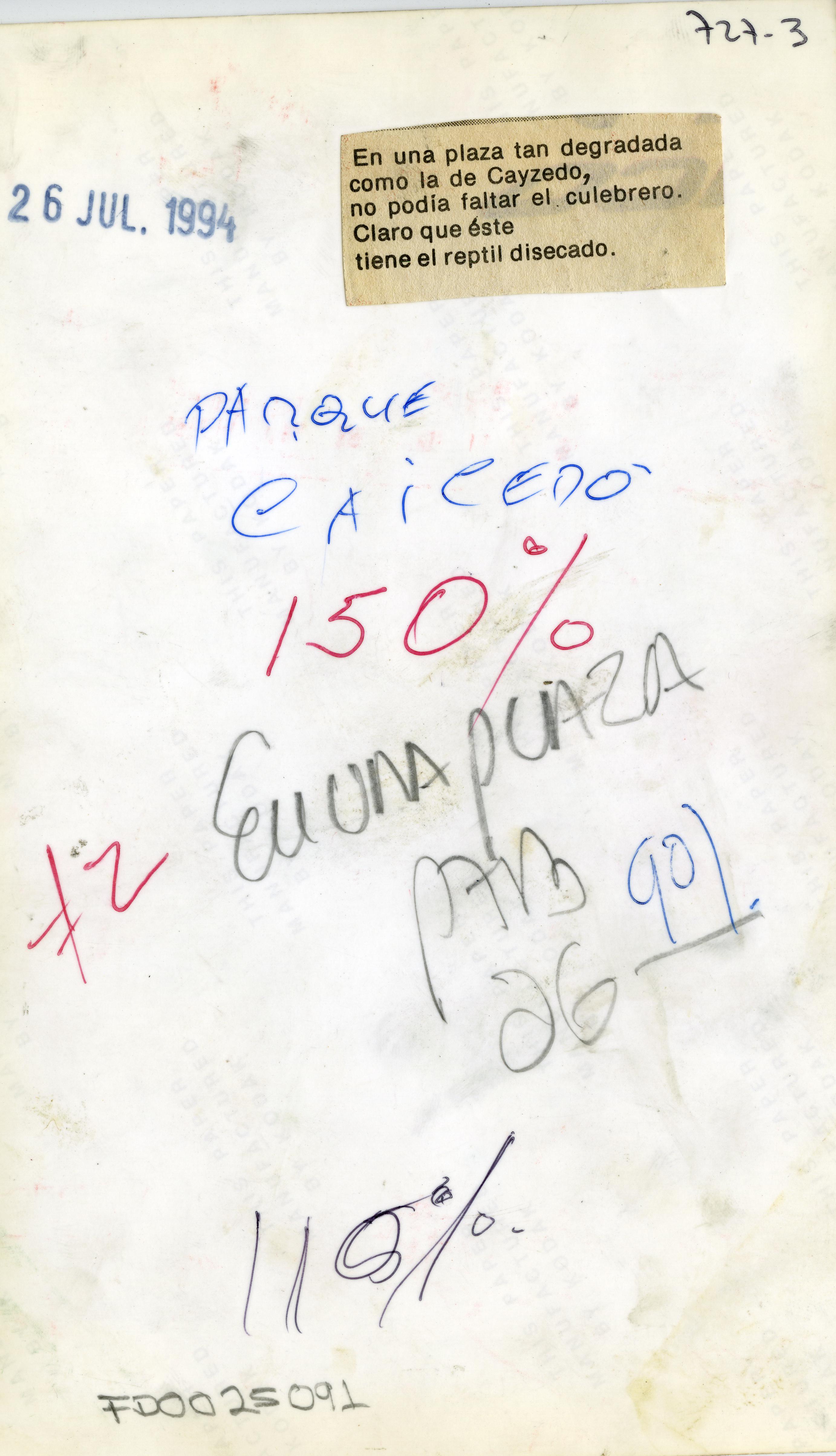 Al reverso de la fotografía se anexa recorte: En una plaza tan degradada como la de Cayzedo, no podía faltar el culebrero. Claro que éste tiene el reptil disecado