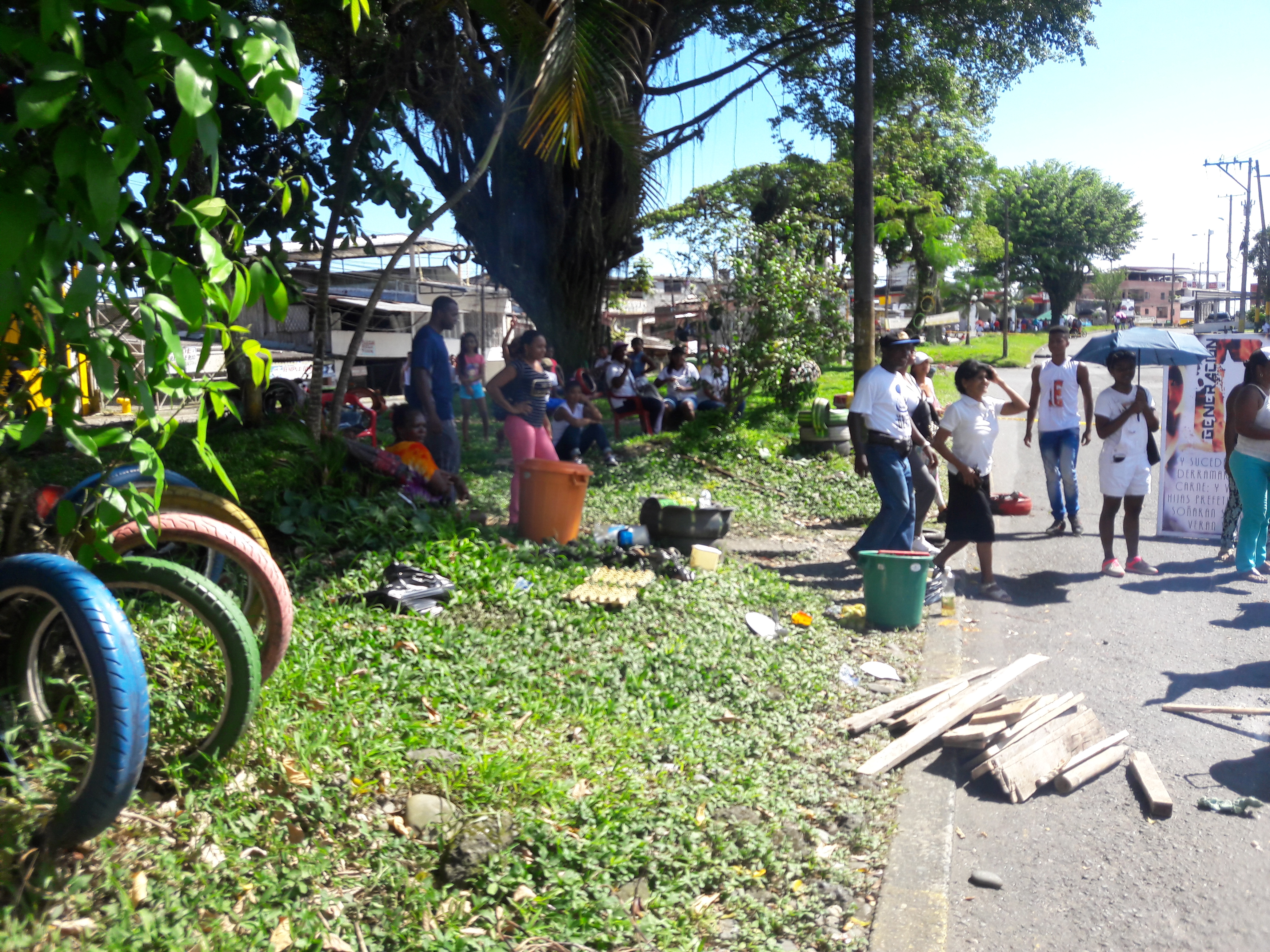 Un pequeño grupo de manifestantes, junto a una zona verde donde se compartieron alimentos durante el paro cívico de Buenaventura.