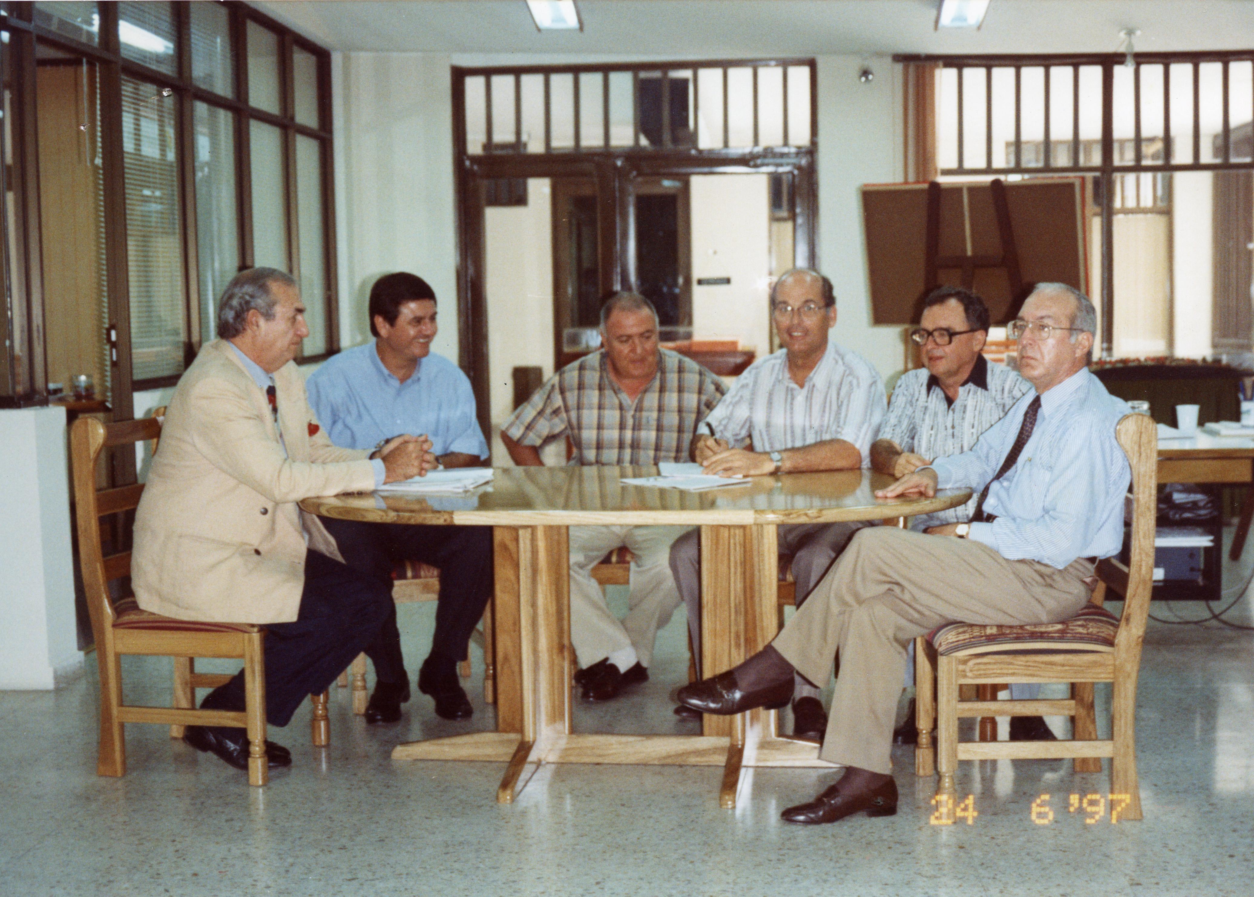 Al reverso de la fotografía se anexa recorte: Aspecto de la firma de la escritura de construcción del Supercentro Tuluá la 14, un hipermercado que se hará en esa ciudad Vallecaucana con 500 parqueaderos. De izquierda a derecha el arquitecto Nelsón Illidge; el gerente de la 14, Carlos Arturo Cardona; el Notario Primero de Tuluá, Alberto Isaza Botero; el gerente de inversiones Tuluá, Jakob Olivier; el abogado de la 14, Alonso Vélez, y el coordinador del proyecto, Nelsón Montoya