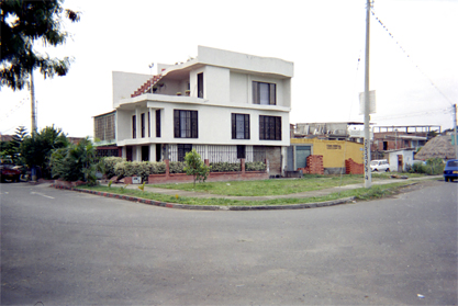Plano general de residencia de tres plantas en esquina de barrio. Edificada en cemento y pintada de blanco. Toma fotográfica desde una intersección de la vía.