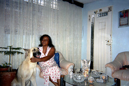 Plano medio. Interior día. Mujer abrazando un perro en costado izquierdo. Realce de textura con repliegues de fondo. Sobresale mesa con juego en cristal tallado.