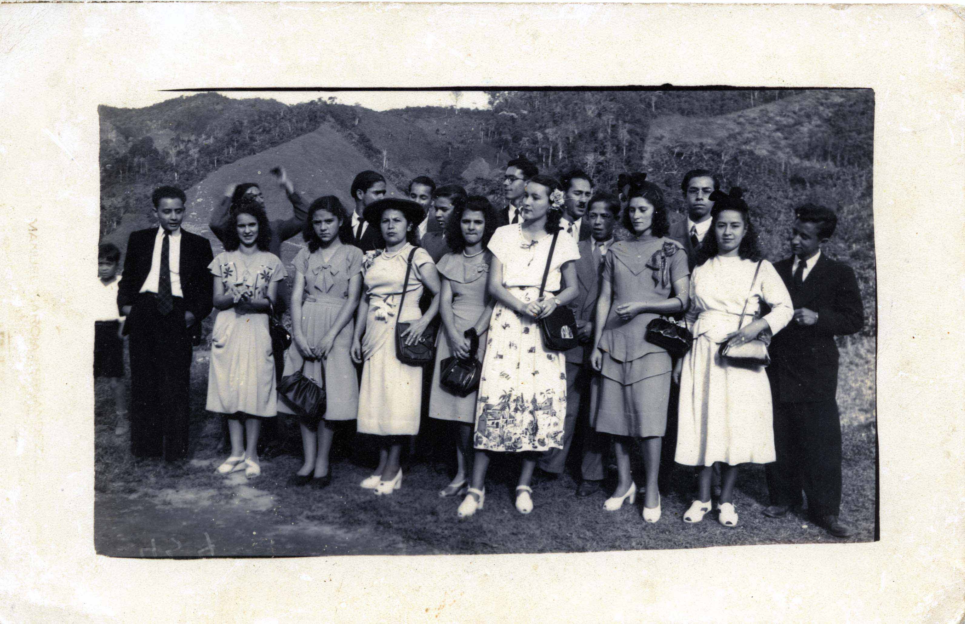 Argelia, Valle del Cauca. Fundado en 1904, por Manuel Mejía, José Antonio Murillo, Epifanio Chávez y Justiano Hincapié. Municipio desde 1956. Ester Parra, barrió Monserrate. Observamos en la imagen que se destaca un grupo de personas conformadas por varias mujeres y hombres. Se aprecia la elegancia de la ropa y al fondo la belleza de la naturaleza