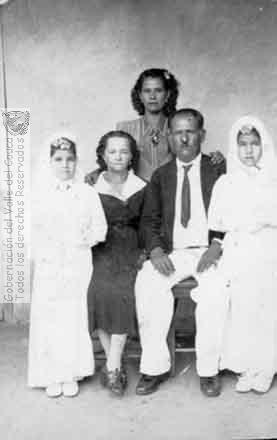 Celebración de la Primera Comunión de Flor y Leonor Galeano. Les acompañan José Manuel Muriel, Isabel Cardona de Muriel, Dolores Muriel, Flor Galeano y Leonor Galeano. Buga, C. 1955.