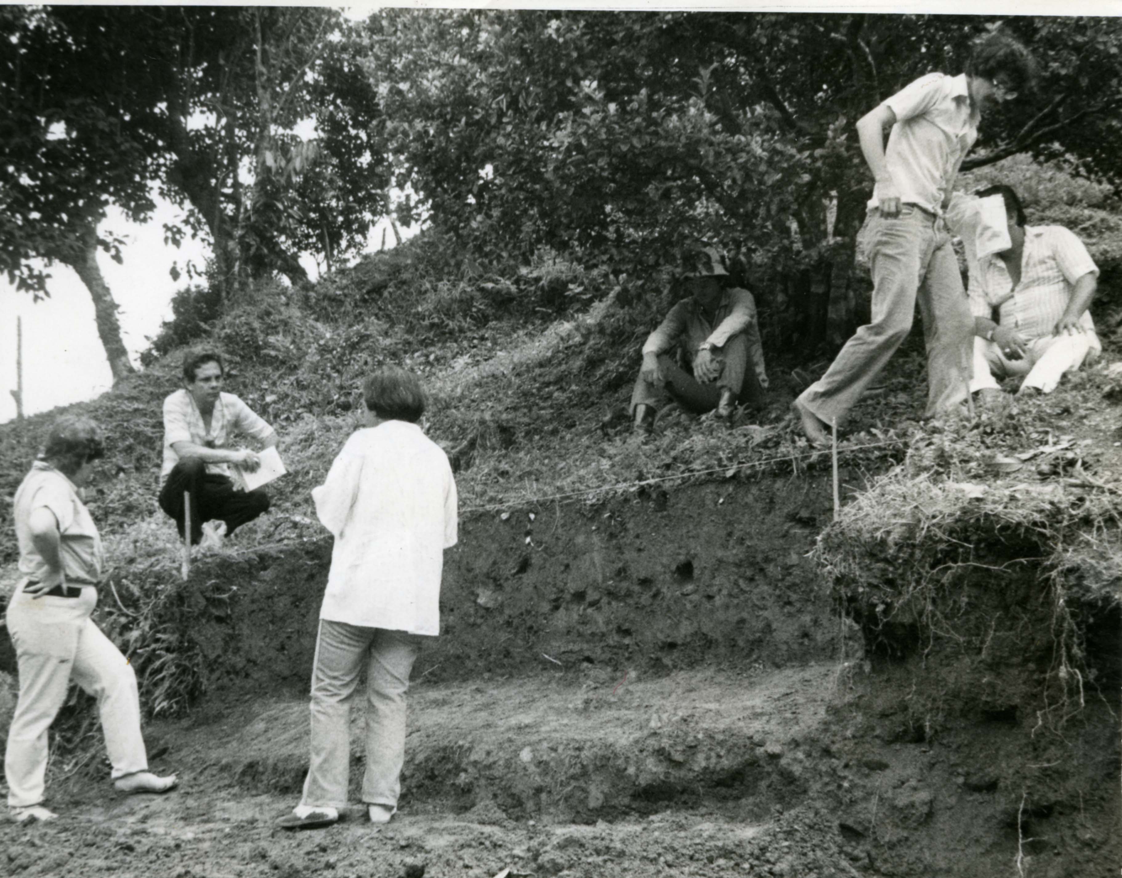 Información al reverso de la foto: Excavación realizada en predios del señor Ricardo Millán en la zona alta de Pance. En este sitio se excavó en la pared de un tambo, en lugar del piso. En la trinchera 2 como se le conoce, se encontraron tiestos muy finos, pintados y decorados y son semejantes a los del periodo Yotoco de la región Calima.