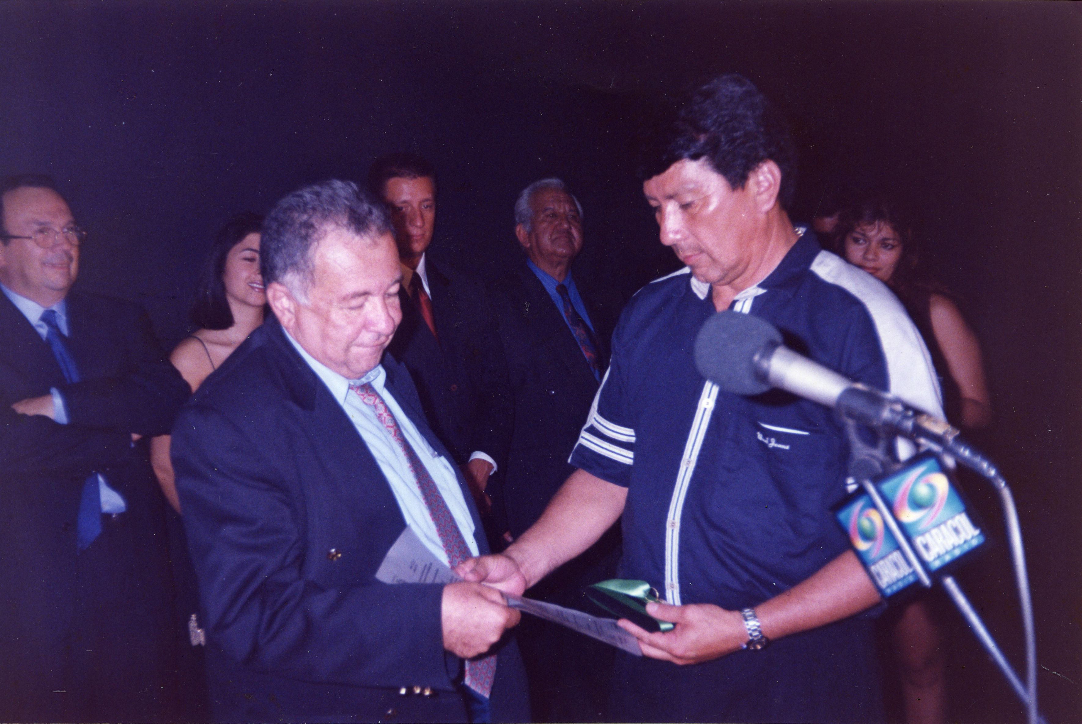 En la gráfica se observa al periodista Godofredo Sánchez recibiendo un diploma de otro hombre.
