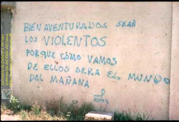 Grafitti callejero. Barrio Floralia, Cali, fecha por identificar. Leyenda. "Bien aventurados sean los VIOLENTOS porque como vamos de ellos sera el mundo de mañana".