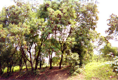 Plano de contexto. Bosque. Sobredimensión objetual por encuadre. Gama de verdes en escena. Pequeña porción celeste en superior derecho.