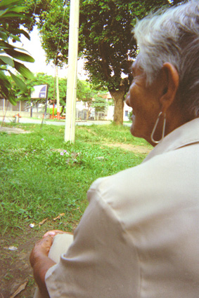 Plano Medio. Contraplano de una mujer adulta con su mirada dirigida hacia un parque al fondo. Se destaca la vegetación abundante y los árboles frondosos ubicados junto a una cancha en el fondo.