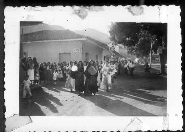 Procesión en la fiesta de La Inmaculada Concepción. Nótese los vestidos largos negros y blancos y el uso de mantillas de las mujeres que encabezan la procesión. Bolívar 1955