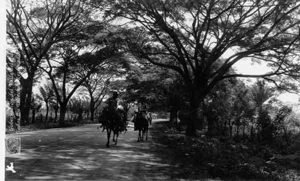 Carretera a Juanchito. Los caballos fueron el medio de transporte mas utilizado en las veredas y pueblos del Valle. Santiago de Cali, fecha aproximada, 1940.