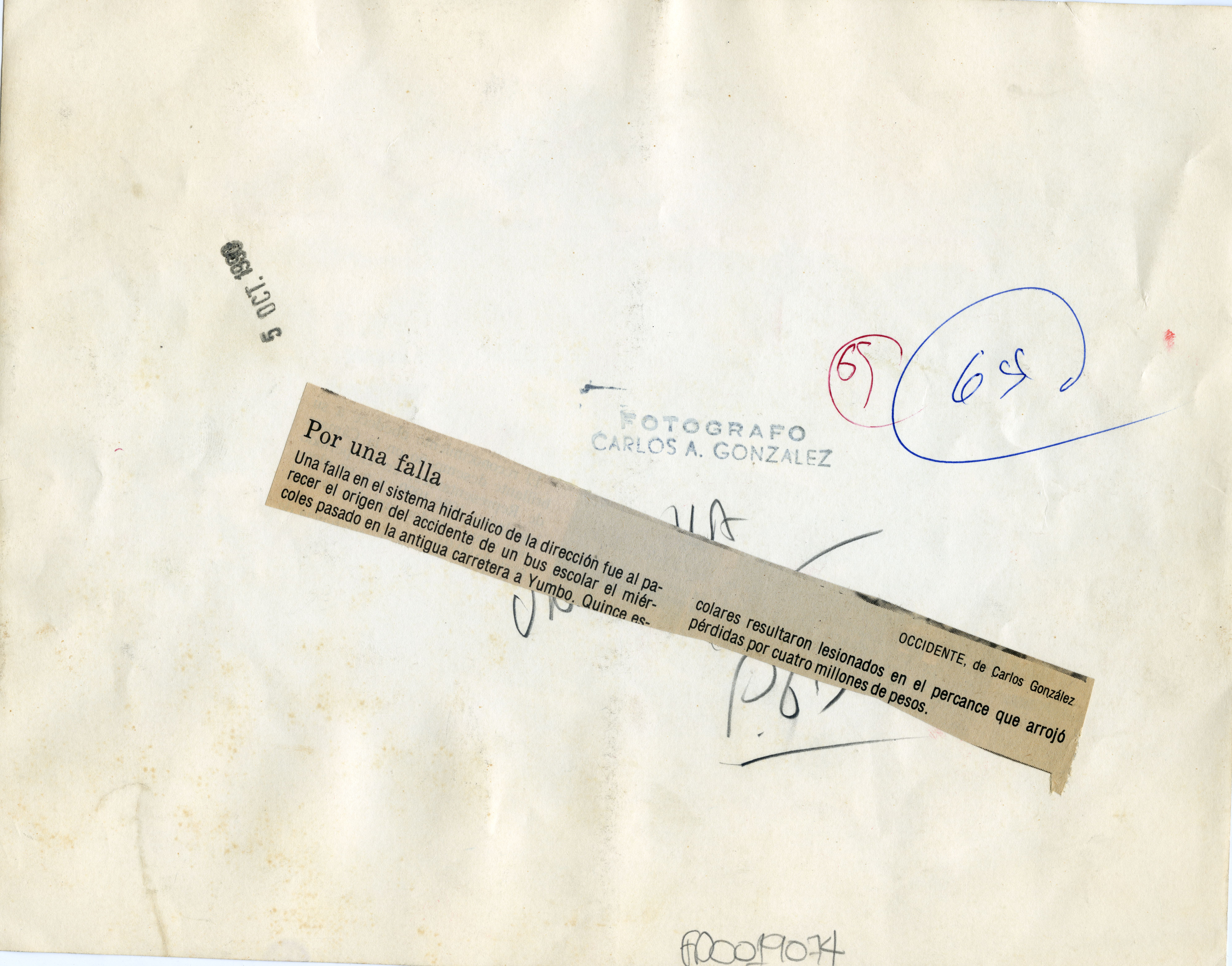 En la fotografía podemos observar el accidente de tránsito que tuvo un bus escolar, al parecer presentó una falla mécanica y esto terminó en el volcamiento del automotor. Al reverso de la fotografía se anexa recorte: "Por una falla. Una falla en el sistema hidráulico de la dirección fue al parecer el origen del accidente de un bus escolar el miér coles pasado en la antigua carretera a Yumbo. Quince escolares resultaron lesionados en el percance que arrojó pérdidas por cuatro millones de pesos."