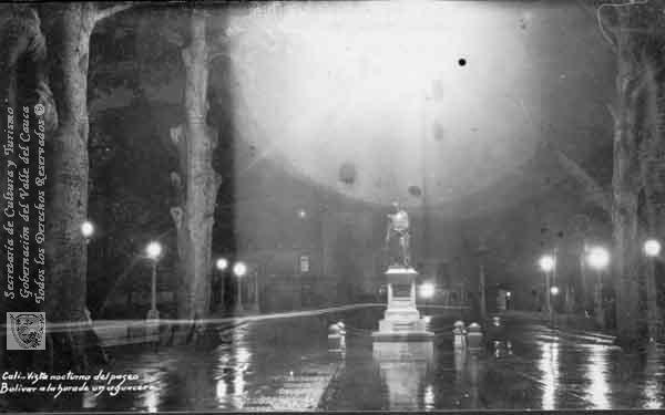 PEDRO ANTONIO RIASCOS (1900). Vista nocturna del monumento al libertador, donado por la Asamblea Departamental del Valle del Cauca, en el Paseo Bolivar & 301057. OTRO: Biblioteca Departamental Jorge Garces Borrero.