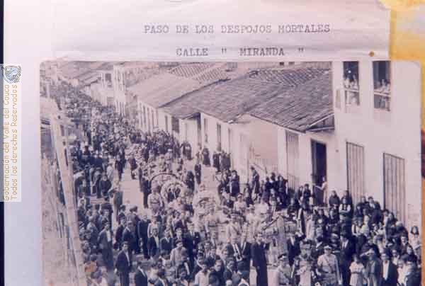 Entierro de Heraclio Uribe Uribe, fundador de Sevilla. Desfile fúnebre por la calle Miranda. Sevilla. C. 1942