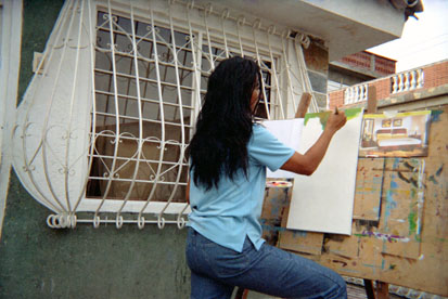 Plano medio. En enfoque central mujer pintando. Contraste de superficies blanca sobre superficie con manchas de pintura en costado inferior derecho.