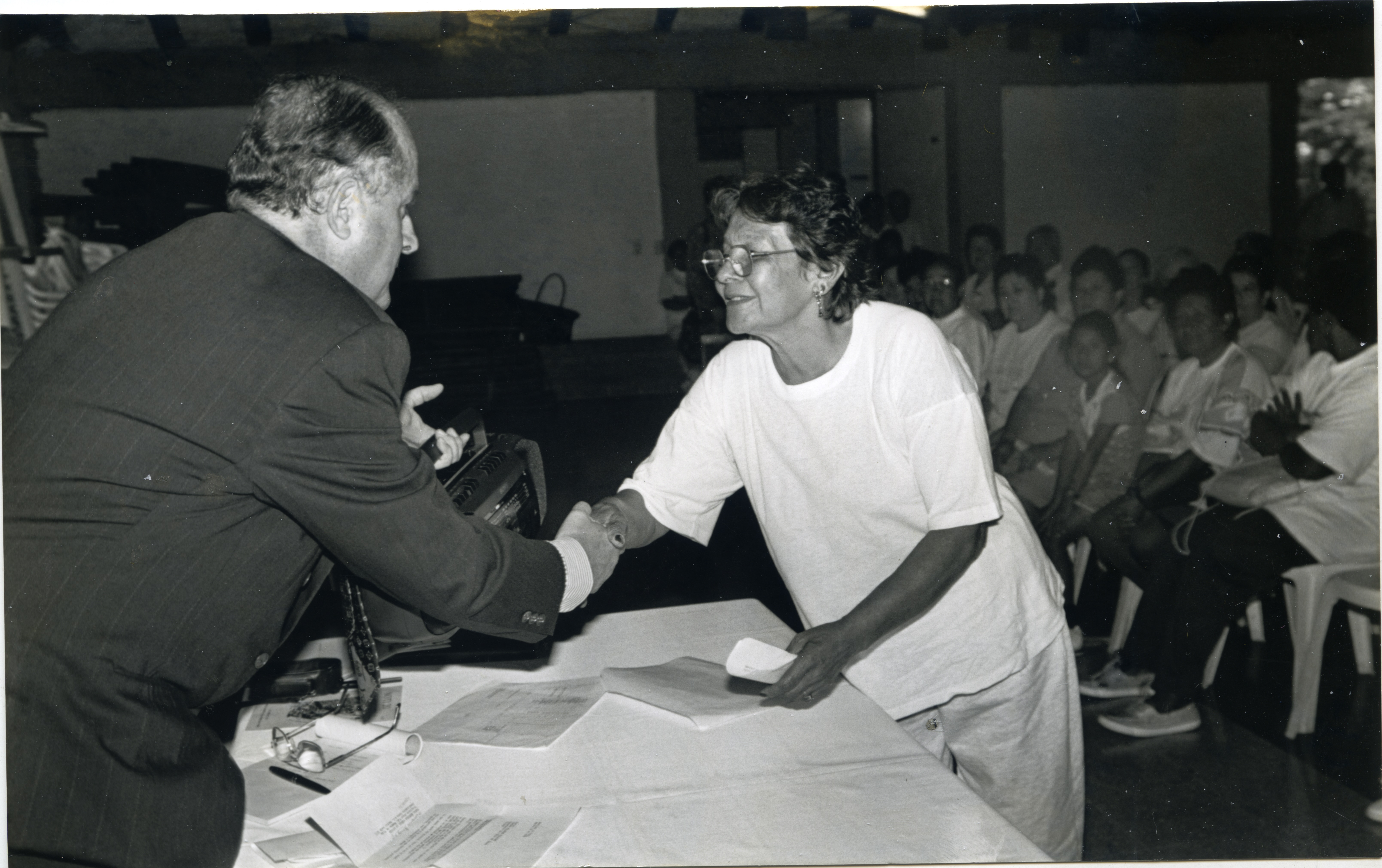 Al reverso de la fotografía se anexa recorte: " Dotación de equipos médicos y elementos para prácticas entregó el gobernador Germán Villegas Villegas, a grupos de tercera edad de Cali dentro del programa de atención a los "Queridos viejos" que viene desarrollando la administración departamental a través de la secretaría de salud por valor de $100 millones."