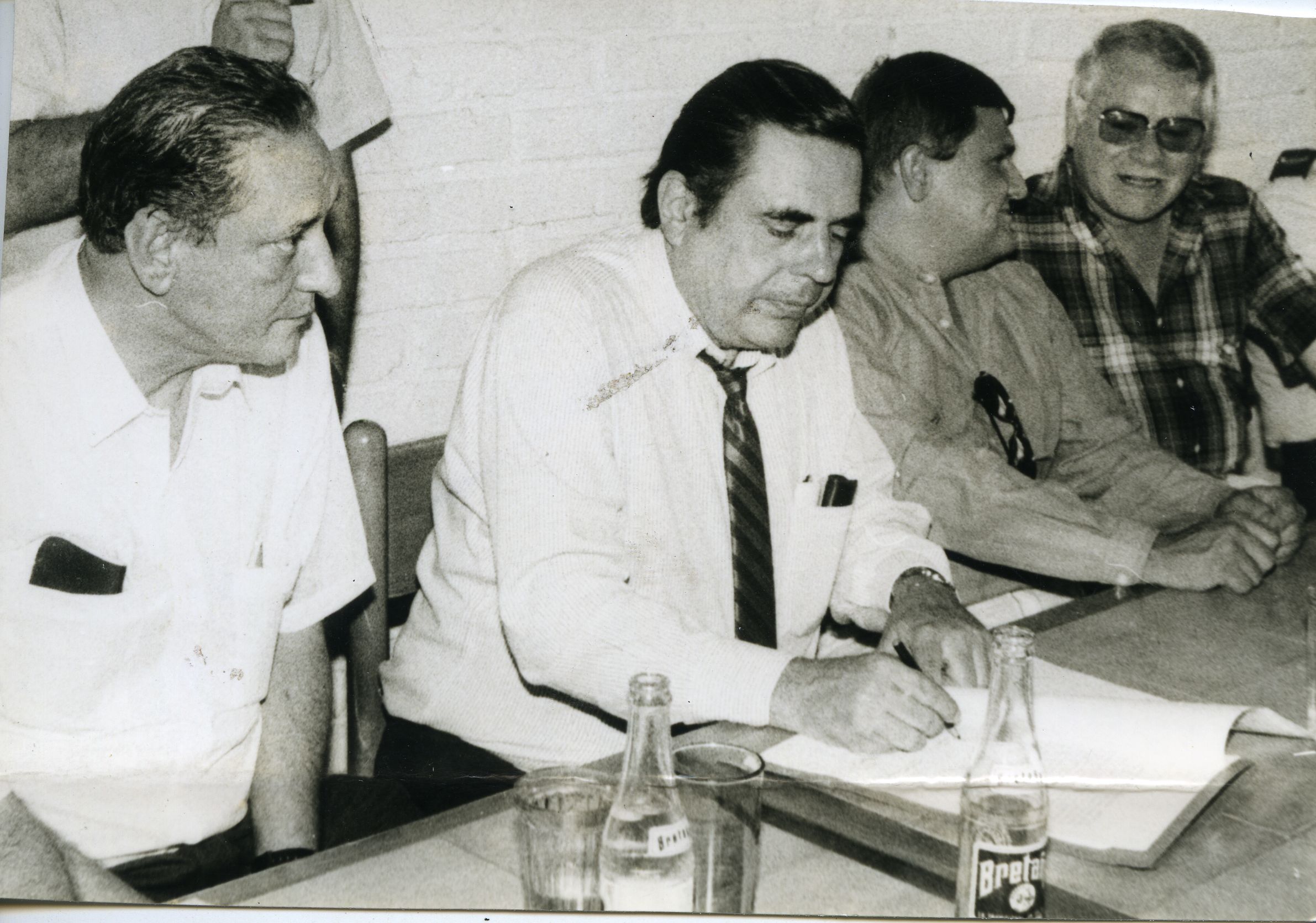 La foto retrata el momento en que el entonces gobernador del Valle del Cauca, Ernesto González Caicedo, firma el aporte de 30 millones de pesos para la terminación del aeropuerto Santa Ana, en cuandro, junto con el gobernador, el alcalde Fernando Ramírez y el parlamentario Fabio Salazar.