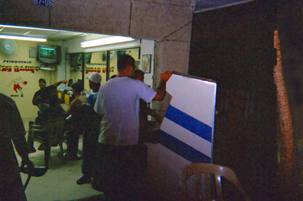 Plano Medio. Imagen tomada desde el exterior de un local comercial hacia el interior, con luz de flash. Se destaca principalmente en el interior un grupo de hombres jóvenes de raza negra en su mayoría sentados en una peluquería. Afuera en la penumbra dos hombres jugando en una maquina.