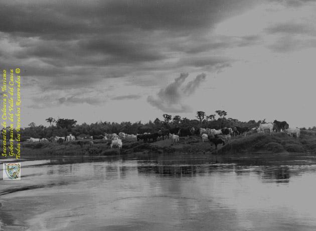 Ganado pastando en las riberas del río Cauca, Santiago de Cali, 1950.
