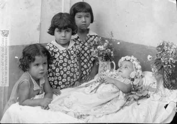 Flor, Leonor y Jorge Galeano, velan a su hermanito Juan fallecido. Buga, C. 1950. En las primeras décadas del siglo XX, se acostumbraba arreglar a los niños difuntos con muchas flores, corona y alitas de angel, dada la creencia en que moría un niño pero el cielo ganaba un angelito.