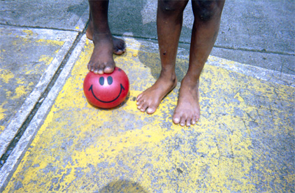 Primer plano. Toma en picado. Pies de dos niños descalzos. Uno de ellos sostiene un pelota inflable con una carita feliz debajo de su pie. Las sombras de los niños se proyectan inmediatamente después de sus cuerpos en el pavimento. Loa niños se encuentran parados en una cancha de cemento.