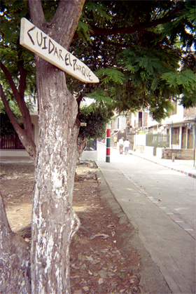 En primer plano letrero (cuidar el Parque) sobre el tronco de un árbol. Al lado derecho calle. Al fondo residencias. Plano general.