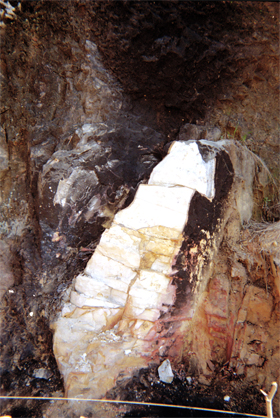 Plano medio. Imagen tomada en exterior, donde se observa lo que parece ser el tronco de un árbol junto a piedra y tierra de color oscuro, con óxidos.