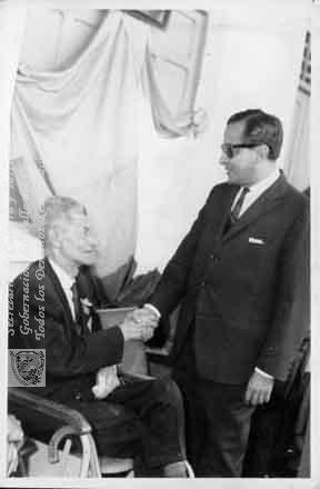 Augusto Domíguez y el Gobernador del Valle, en una reunión. Guacarí. C. 1960.