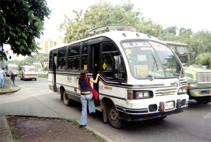 Se observa una mujer en el momento en que sube a una buseta de transporte urbano. Plano general. Toma diagonal.