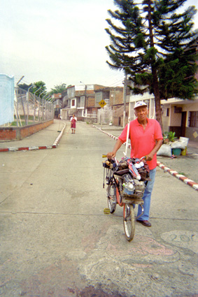 Imagen tomada en exterior. Plano medio, donde se aprecia un hombre caminando por una vía llevando una bicicleta en sus manos y en ella algunos artículos que ha reciclado. AL fondo la fachada de algunas viviendas.