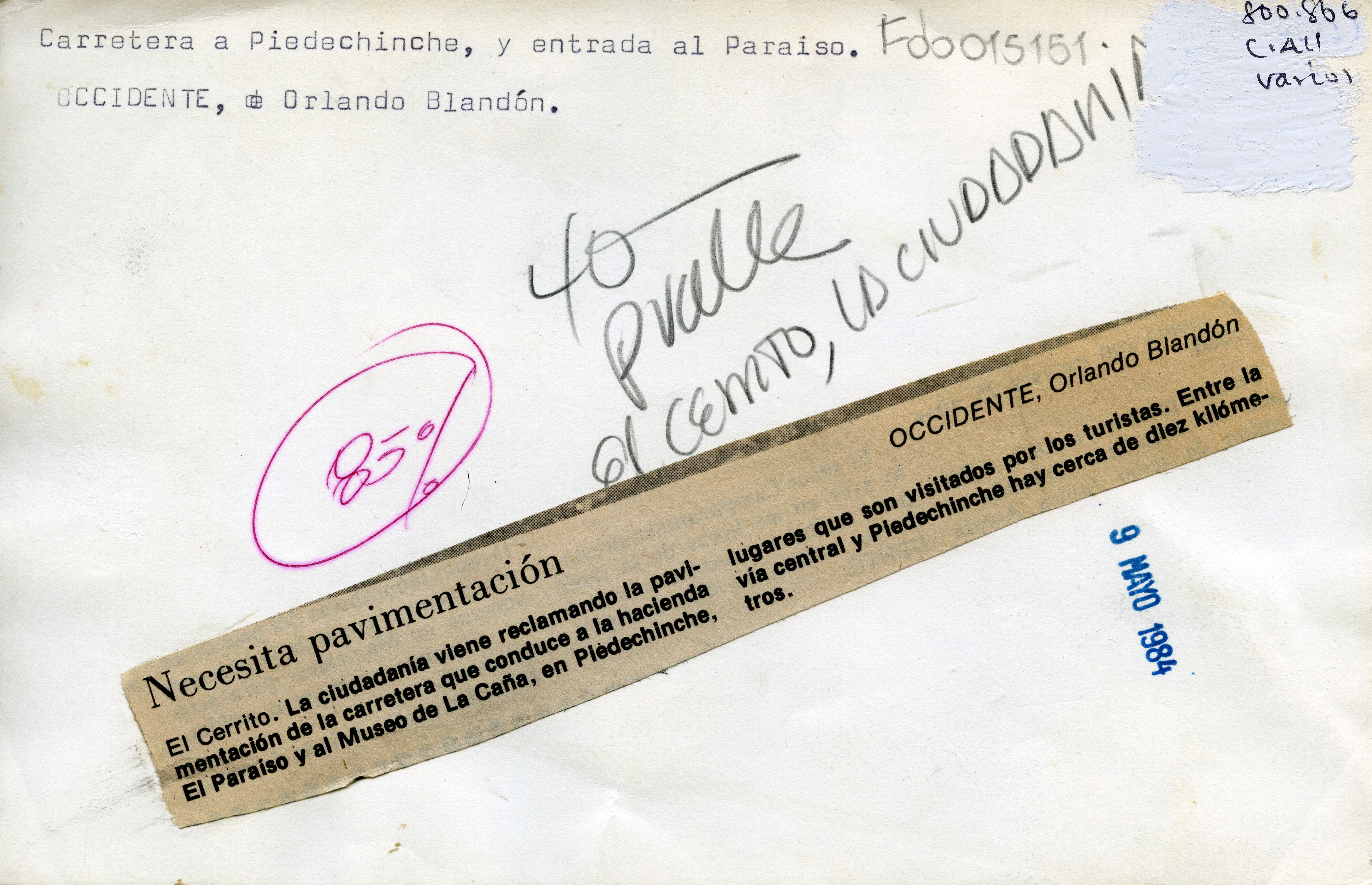 Carretera sin pavimentar. Al reverso de la fotografía se anexa el pie de foto del periódico: "Necesita pavimentación. El Cerrito. La ciudadanía viene reclamando la pavimentación de la carretera que conduce a la hacienda El Paraíso y al Museo de La Caña, en Piedechinche, lugares que son visitados por los turistas. Entre la vía Central y Piedechinche hay cerca de diez kilómetros".