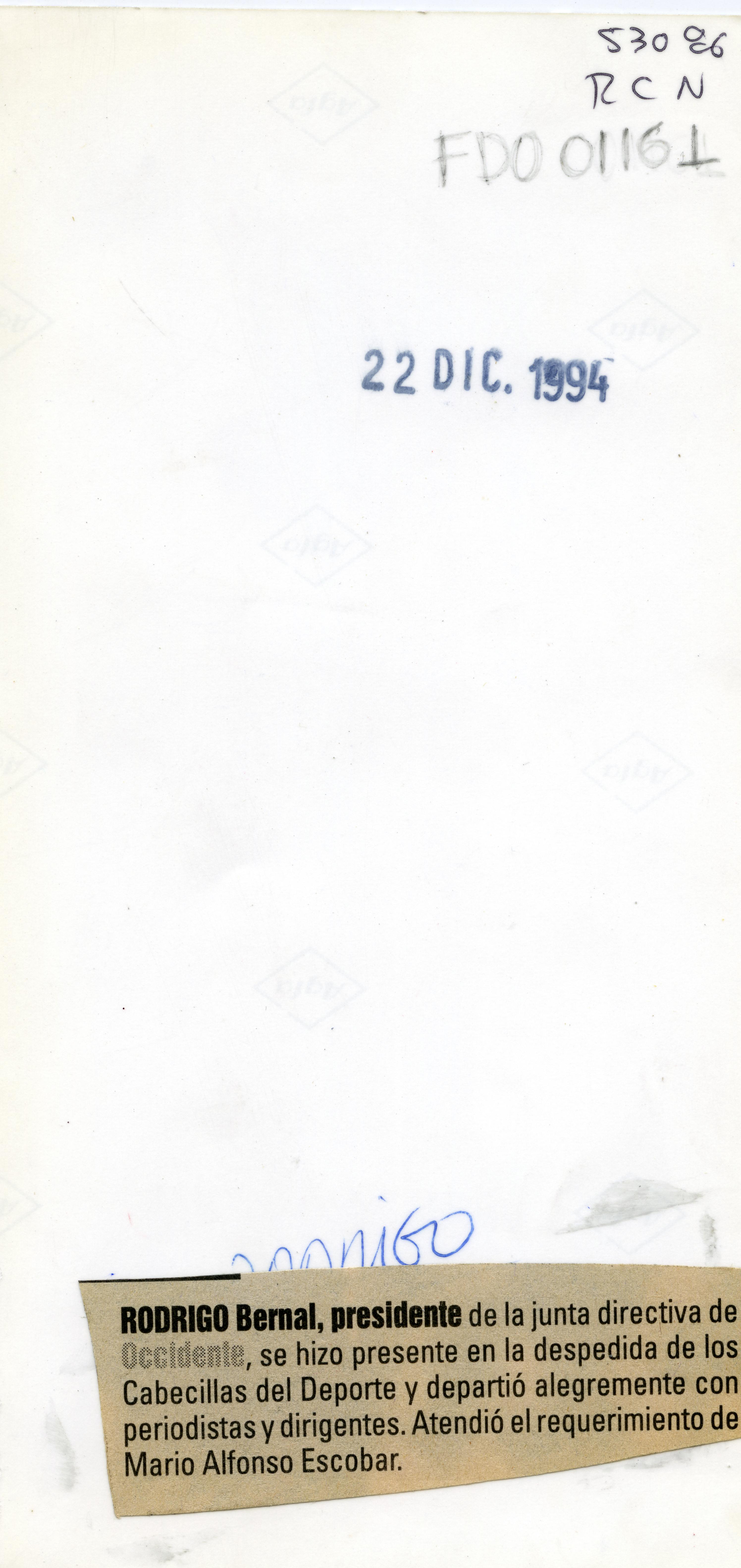 Al reverso de la fotografía se anexa recorte: "RODRIGO Bernal, presidente de la junta directiva de Occidente, se hizo presente en la despedida de los Cabecillas del Deporte y departió alegremente con periodistas y dirigentes, Atendió el requerimiento de Mario Alfonso Escobar"