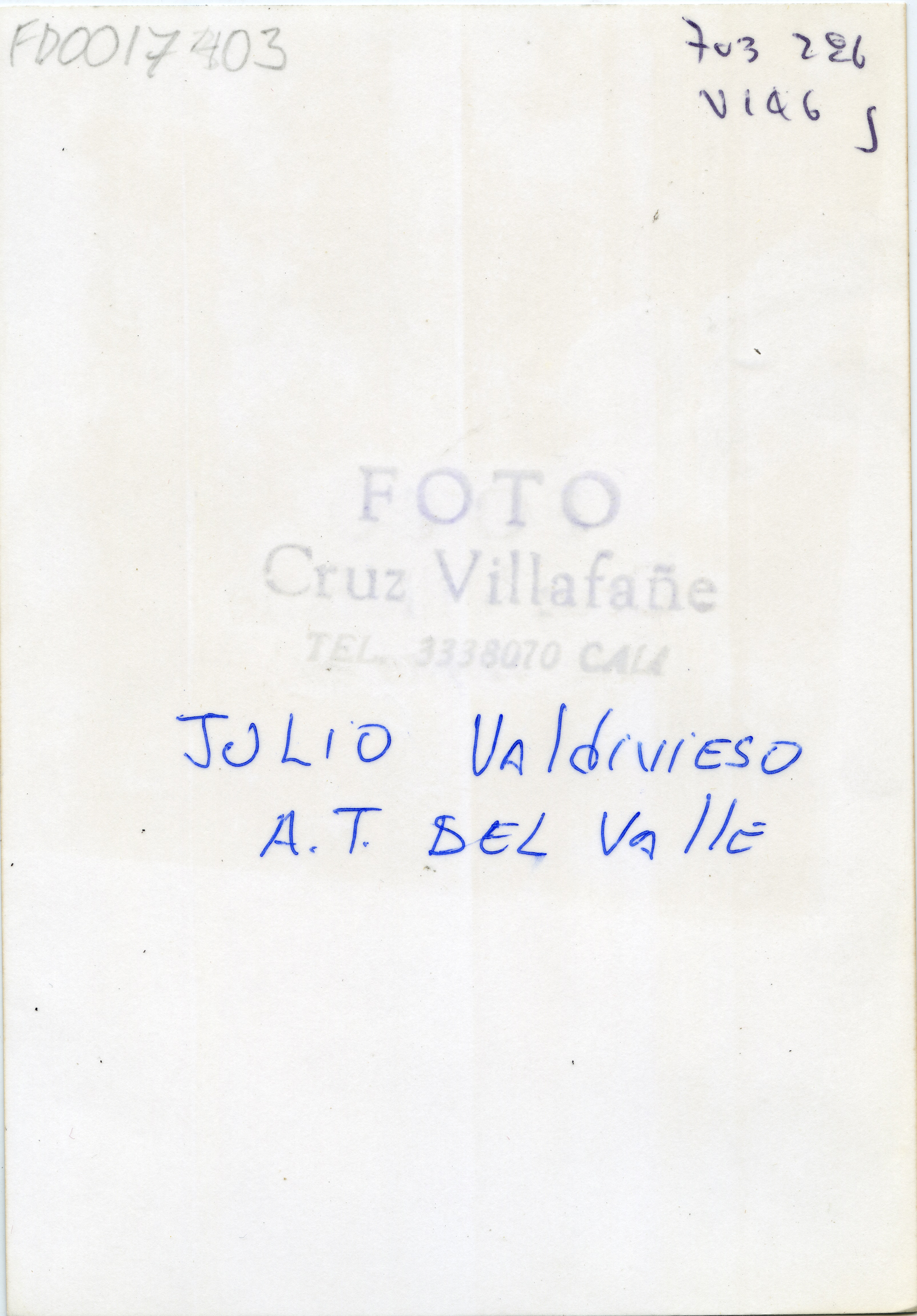 Retrato de julio Valdivieso. Nota en manuscrito reverso de la foto: Julio Valdivieso A.T. DEL Valle. Foto Cruz Villafañe. TEL. 3338070 CALI