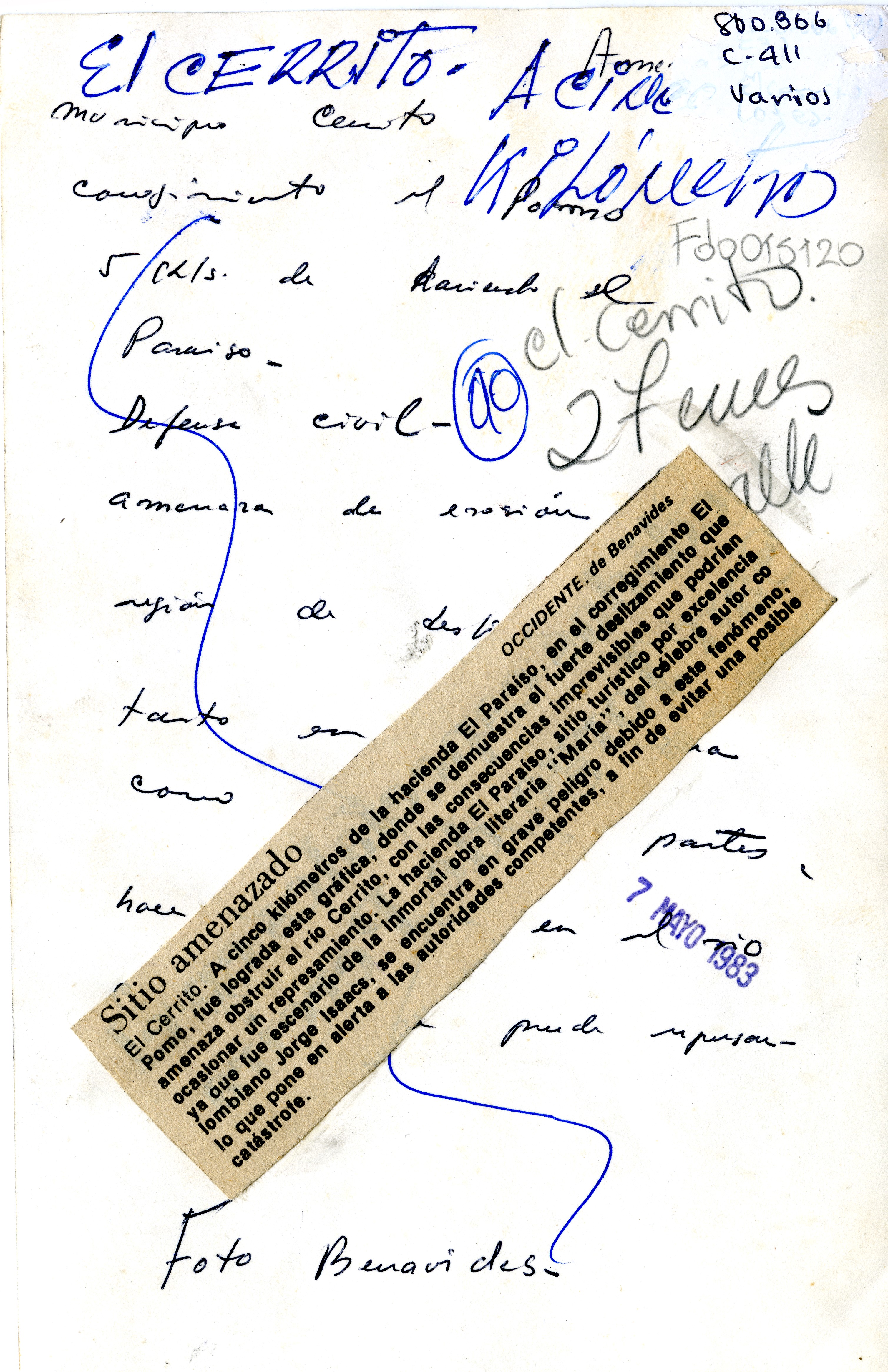 | dc.description.abstract | Desastre Natural en la montaña. Al reverso de la fotografía se anexa el pie de foto del periódico: "El Cerrito. A cinco kilómetros de la hacienda El Paraíso, en el corregimiento El Pomo, fue lograda esta gráfica, donde se demuestra el fuerte deslizamiento que amenaza obstruir el río Cerrito, con las consecuencias imprevisibles que podrían ocasionar un represamiento. La hacienda El Paraíso, se encuentra en grave peligro debido a este fenómeno, lo que pone en alerta a las autoridades competentes, a fin de evitar una posible catástrofe". | spa |