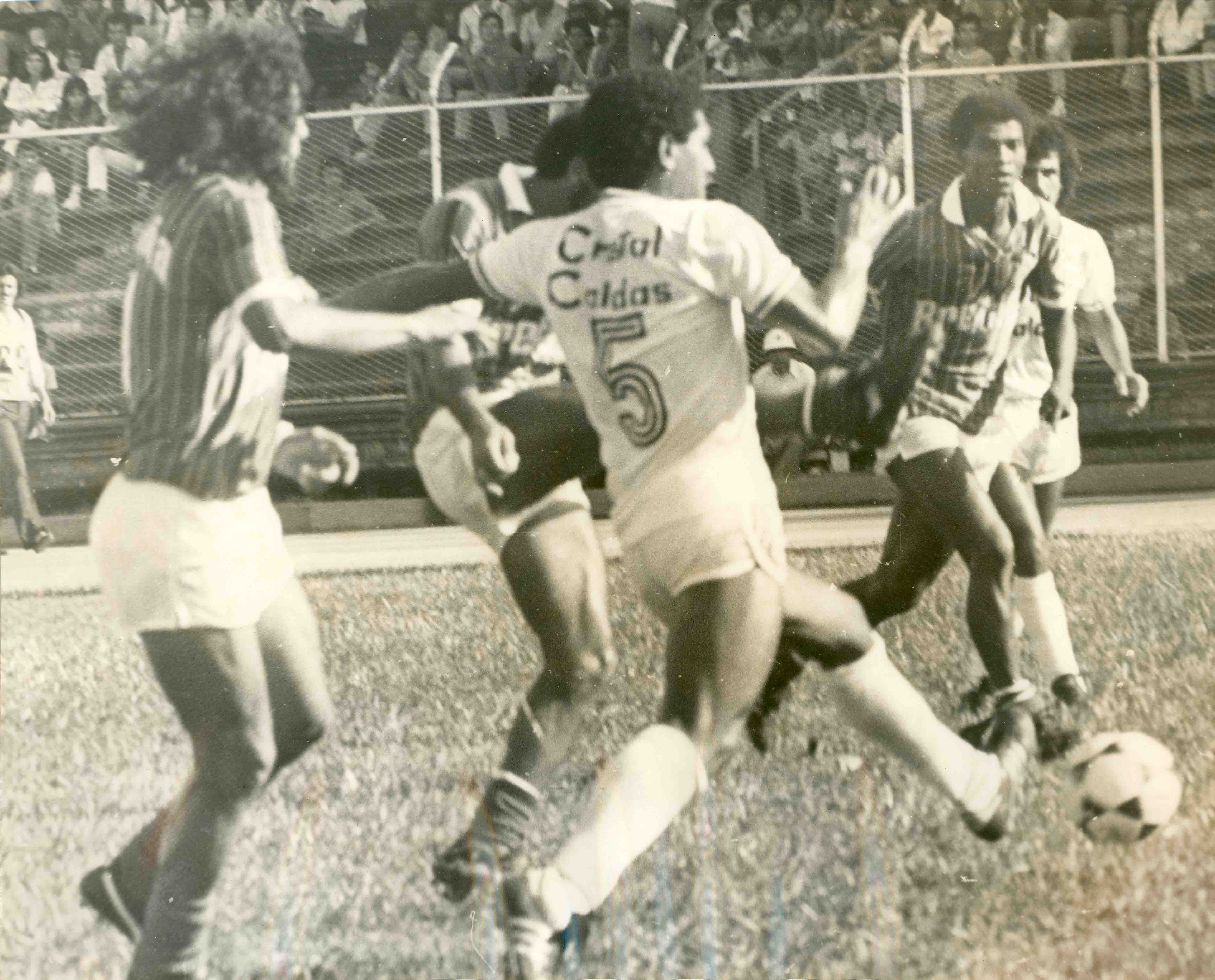 Martínez, L. C. & Diario Occidente (1986). Jugadores del Deportivo Cali en partido contra Cristal Caldas. Santiago de Cali: Biblioteca Departamental Jorge Garcés Borrero.