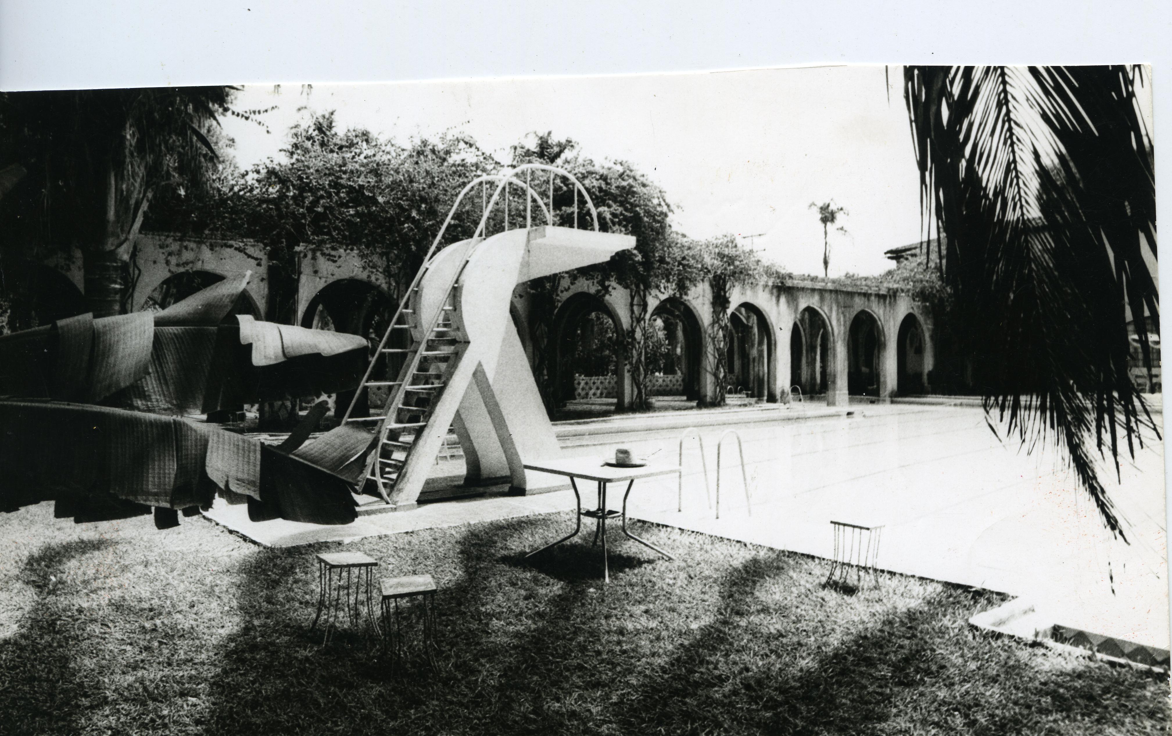 En la gráfica se observan las instalaciones de una piscina ubicada en la ciudad de Buga. Se observa un trampolín y las escaleras para acceder a este. Hay mesas y árboles.