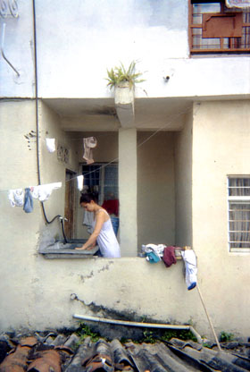 Plano medio. Imagen tomada en exterior, donde se pude apreciar parte de la fachada de una vivienda con muros de color crema, en el centro de la imagen a través de una ventana hay una mujer en un lavadero.
