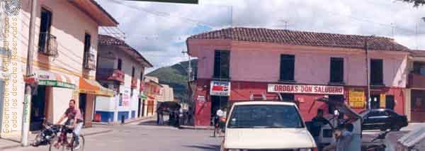 Esquina de la plaza principal de Roldanillo. Al fondo calle peatonal del Museo Rayo. Roldanillo, C.1990.