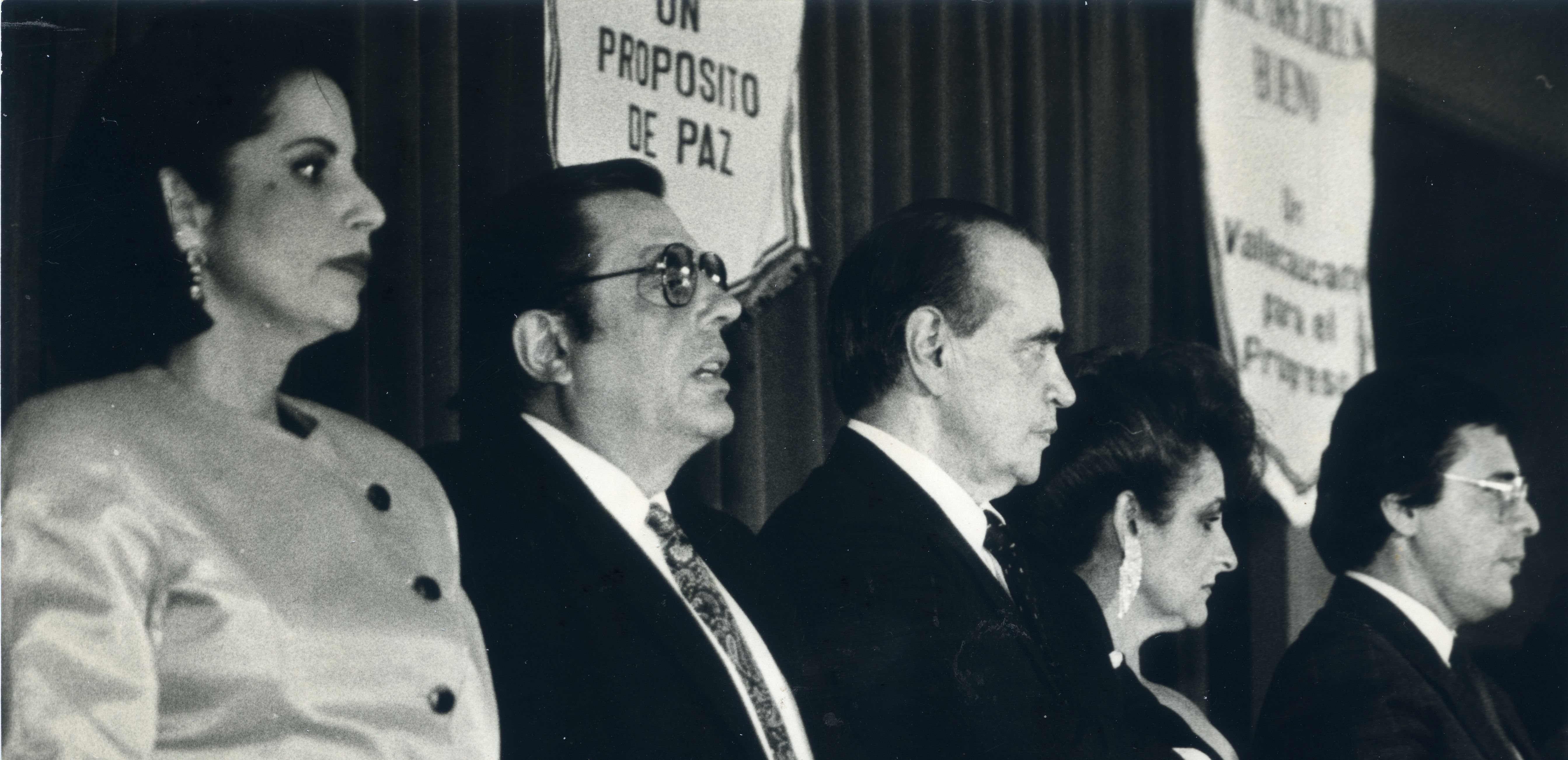 Fotografia de plano medio lcorto de Raul Orejuela, donde se ve con varias personas más, tiene anteojos, y viste de traje y corbata al lado derecho esta una mujer y al lado izquierdo se nota a un hombre, una mujer y otro hombre, en la parte de atras se ve un pendon con la leyenda, Un Proposito de Paz. Al reverso de la fotografía se anexa recorte: " El gobierno de Cali condecoró al ministro de gobierno, Raúl Orejuela Bueno, con la medalla al merito civico, en su maxima categoria, dentro del homenaje que se tributo al personaje de Palmira, en acto cumplido en el hotel intercontinental Cali, de izquierda a derecha, Hortensia Navarro de Orejuela, Ernesto Gonzalez Caicedo Gobernador, el ministro Raúl Orejuela B, Halma Valencia de Gonzalez y el alcalde de Cali, Carlos Holmes Trujillo."