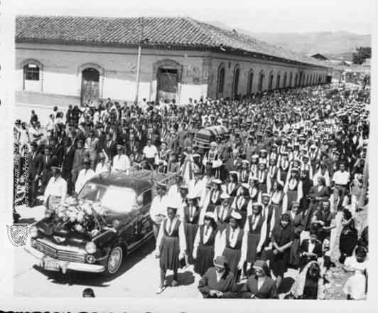 Fotografía de otro departamento: Entierro del Capitán de aviación Edmundo Sandoval. Al fondo la galería, inaugurada en 1917. Fotografía de 1966.
