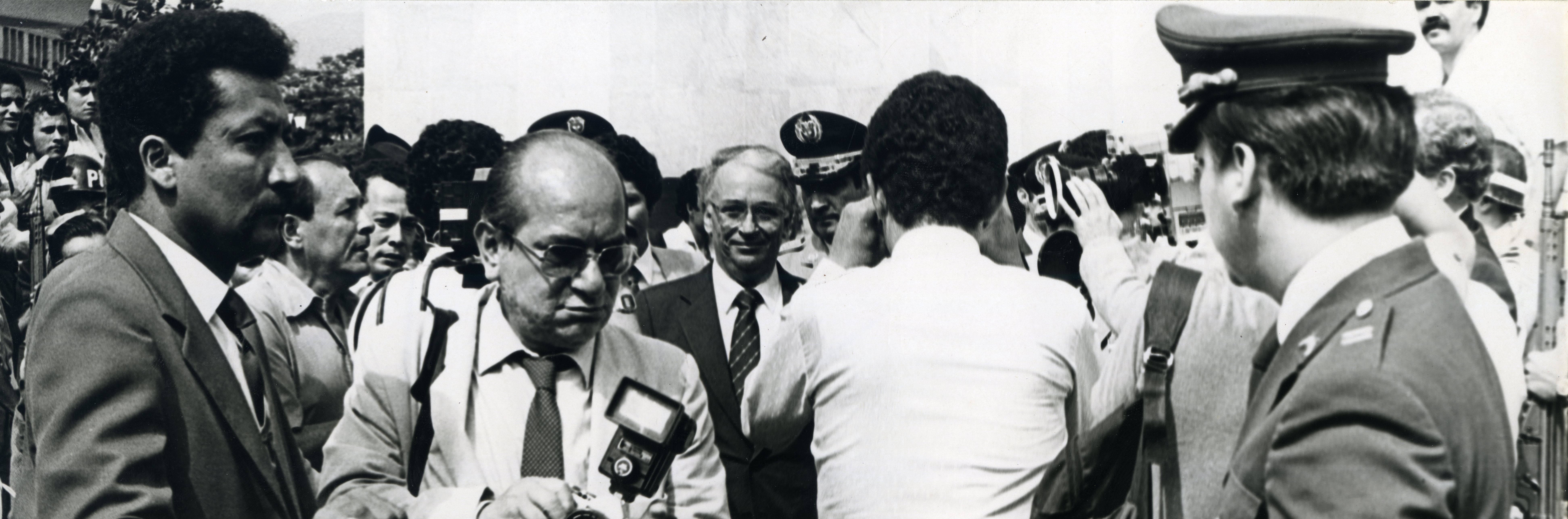 El presidente Belisario Betancur en eventos social, alrededor periodistas y fotógrafos.