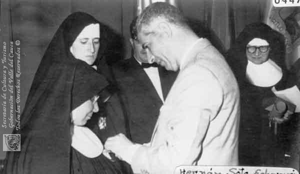 SECRETARIO DE EDUCACION CONDECORANDO A LA HERMANA SOTO ECHEVERRY. C. 1.958
