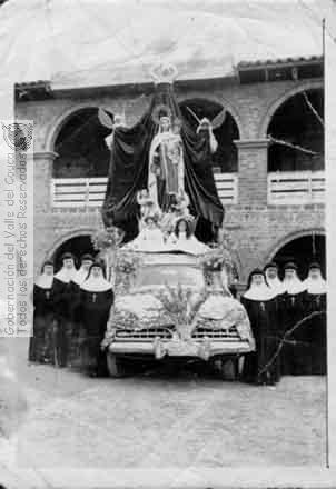 Grupo de hermanas de la Comunidad de San Agustín arreglando la carroza para la procesión de la virgen; también estaban encargadas del Colegio La Consolación. Restrepo, 1950.