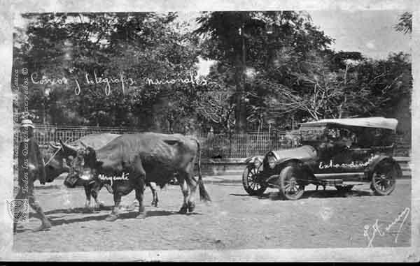 Vehículo halado por una yunta de bueyes en el Parque Bolívar. Palmira, fecha aproximada, 1920.