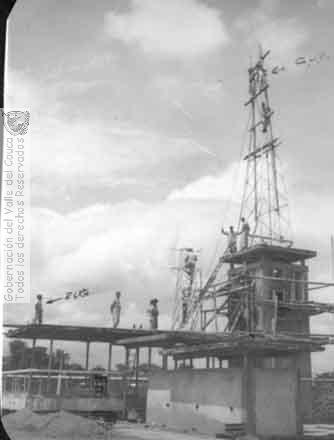 JULIO MONDRAGON (1965). Instalación de la torre de la sirena del cuerpo de bomberos & 602050. ZARZAL: Biblioteca Departamental Jorge Garces Borrero.
